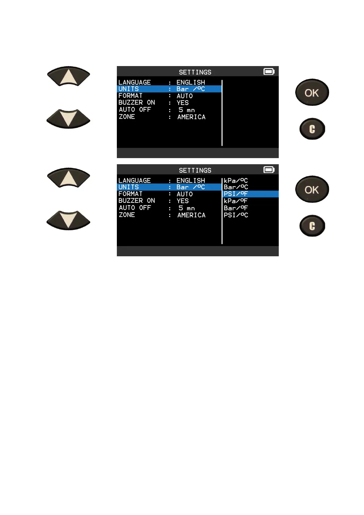 UNITS: change the air pressure and temperature display (kPa, Bar or PSI with F° or C°).