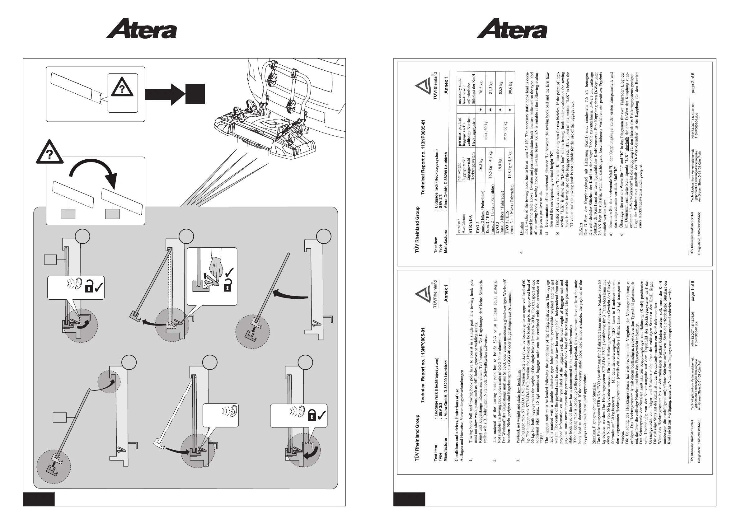 Atera STRADA EVO - Technical Specifications and Towing Compatibility; Towing Hook Requirements and Limitations; Payload, Weight, and Static Hook Load; D-Value and Towing Hook Suitability Diagrams