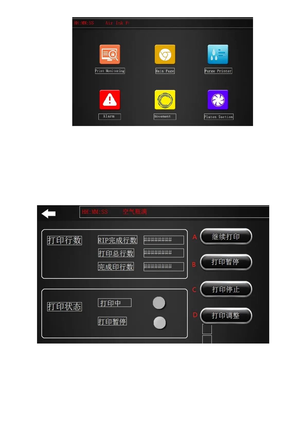 The interface includes the ‘print monitoring’, ‘main page’, ’purge printer’, ‘alarm’, ‘movement’,