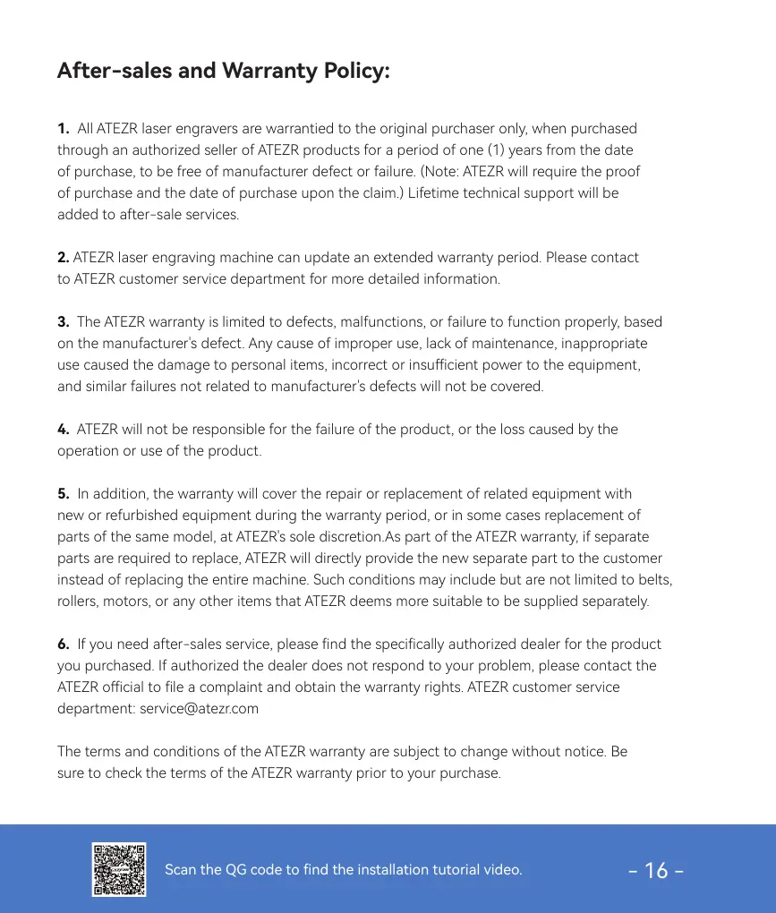 1. All ATEZR laser engravers are warrantied to the original purchaser only, when purchased