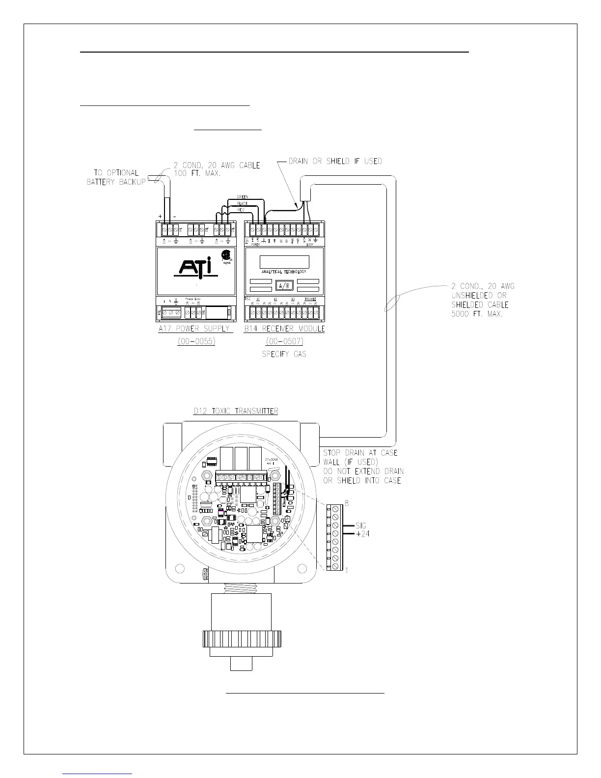 D12 (toxic gas) transmitters may be connected in 2-wire mode to an ATI A17/B14 receiver system. In