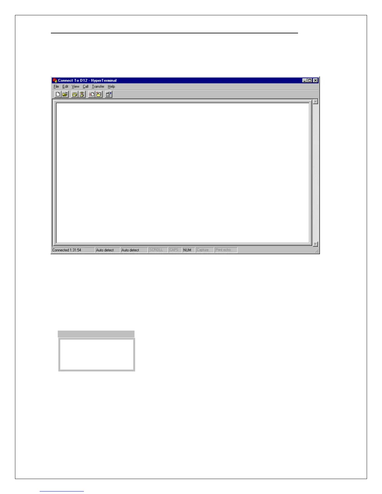 HyperTerminal is now ready to accept a report from the D12 transmitter and save it in a file. Note that