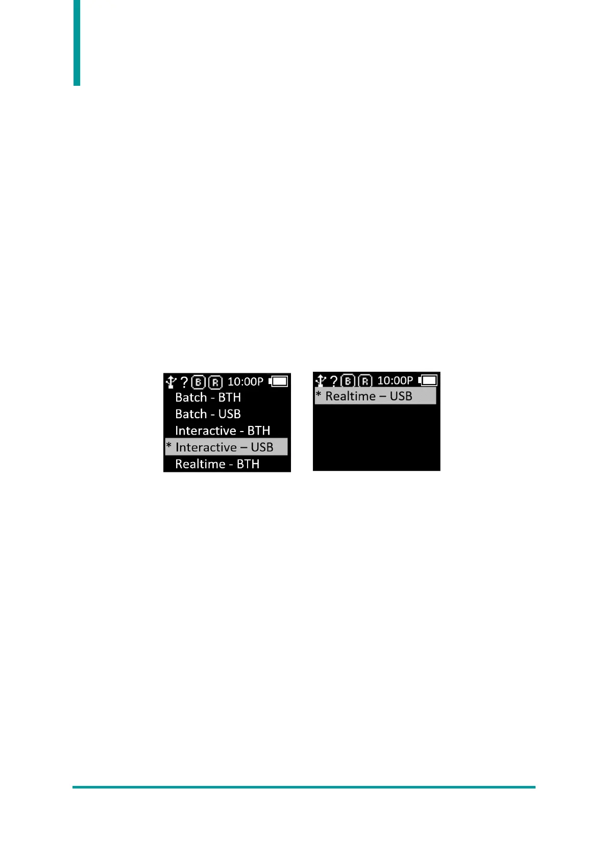 • Batch – USB : The captured data is saved in the internal storage and then sent to the host device
