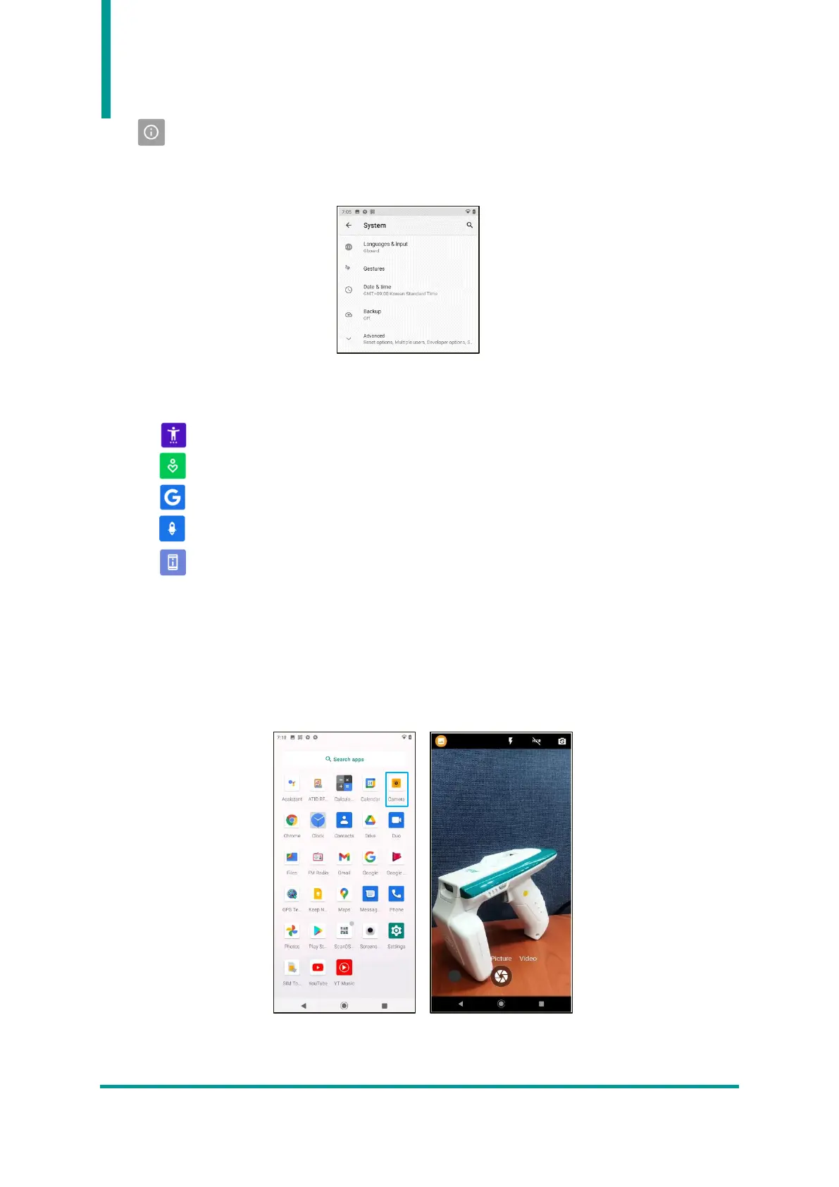 photos and videos through the built-in camera app. User can change settings such as brightness and