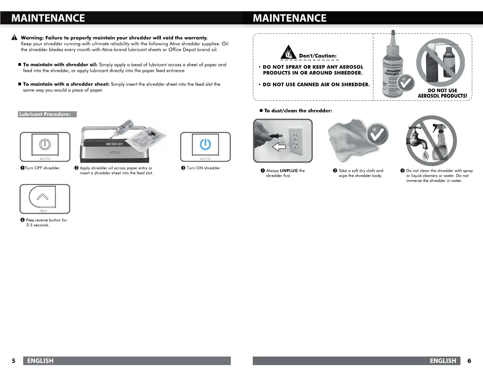 Ativa A08MC19 - Maintenance; Lubrication Procedures; Cleaning the Shredder; Maintenance Precautions