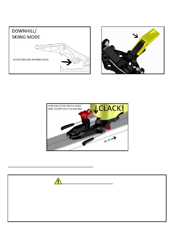 Press on the heel part of the binding in order to step in and to obtain the complete hooking of the boot,