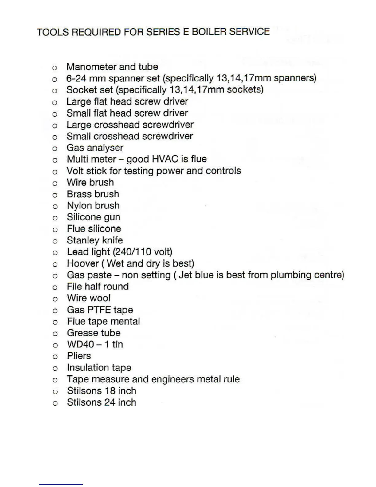 Atlantic Boilers Series E - TOOLS REQUIRED FOR BOILER SERVICE