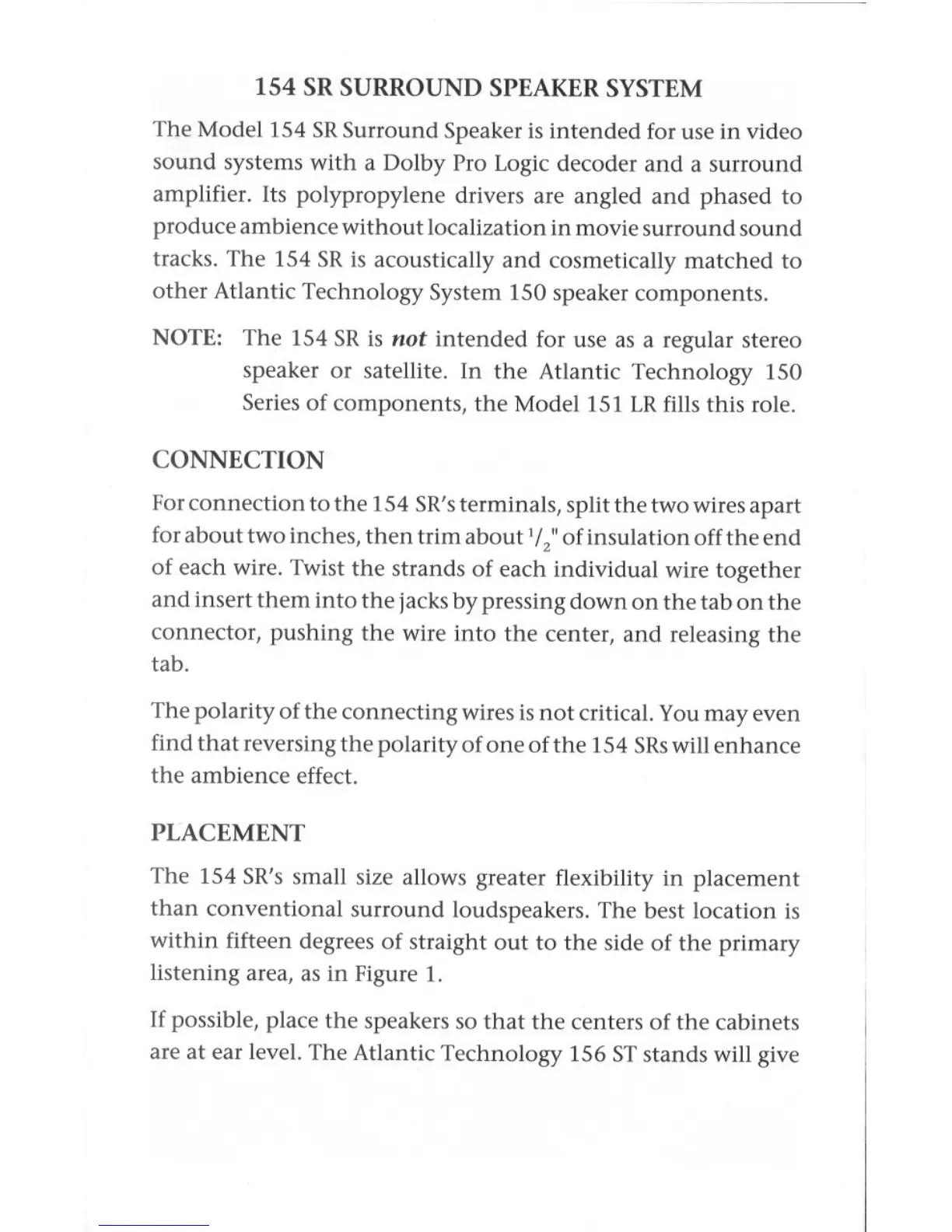 Atlantic Technology 154 SR - 154 SR Surround Speaker System; Connection; Placement