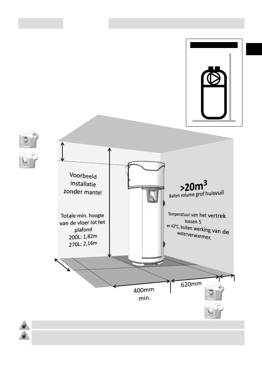 Respecteer de aangegeven minimale afstanden om hercirculatie van de lucht te voorkomen.