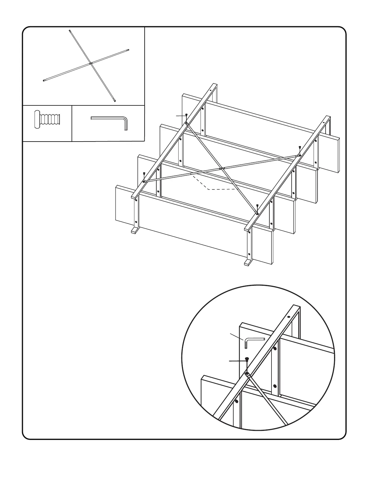 Attach X-brace bars (C) to metal frames (B) with bolts (D)