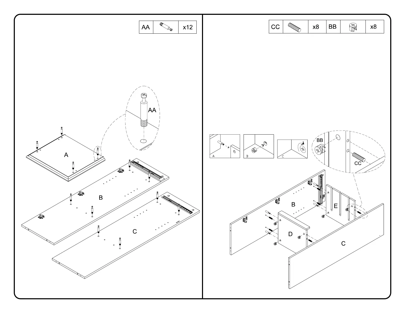 Attach 12 cam screws (AA) to panels A, B and C with a screw-