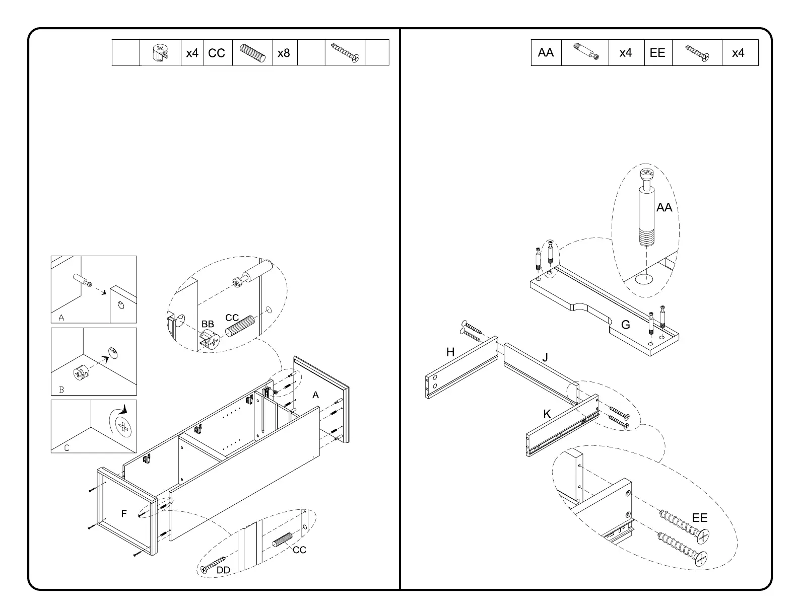 drawer sides H and K to drawer back J with 4 screws (EE).