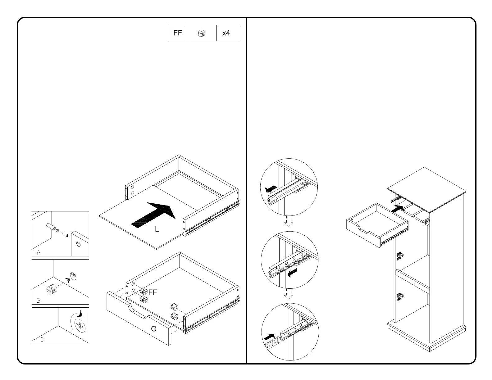 drawer sides. Slide drawer front (G) with 4 cam screws into