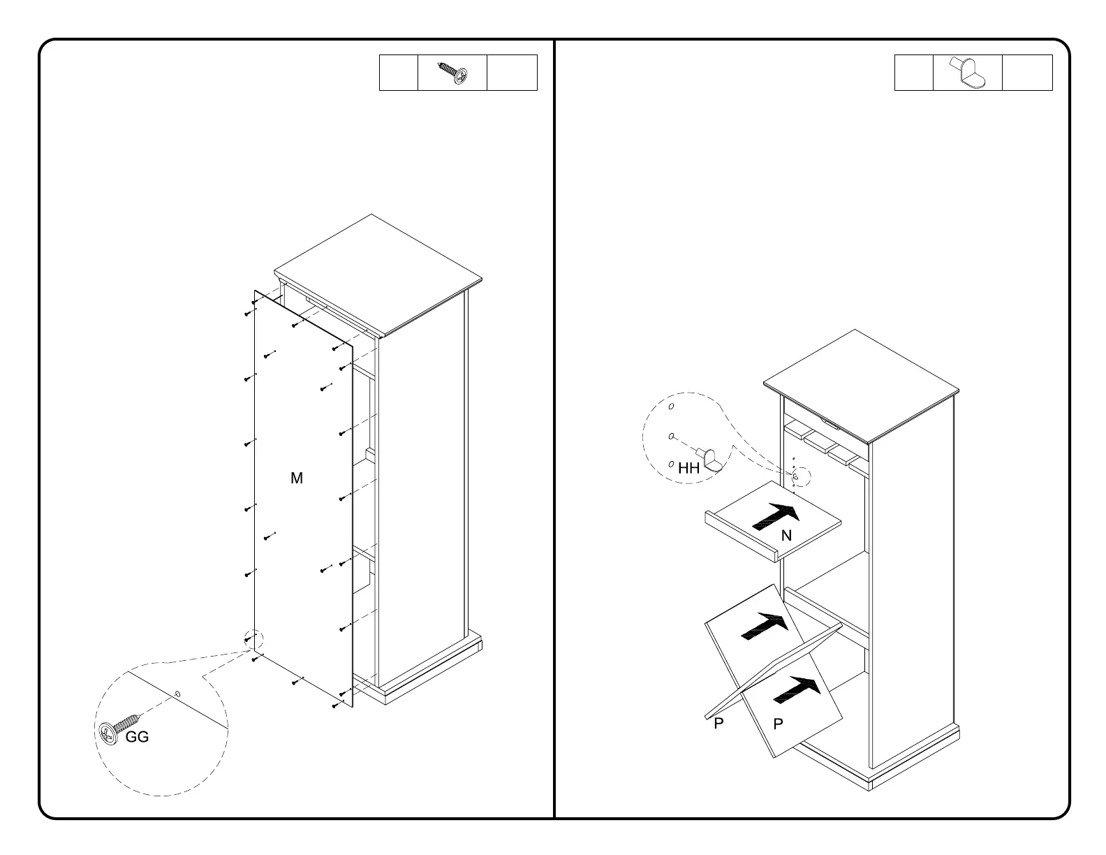 Insert four shelf brackets (HH) in the pre-drilled holes as