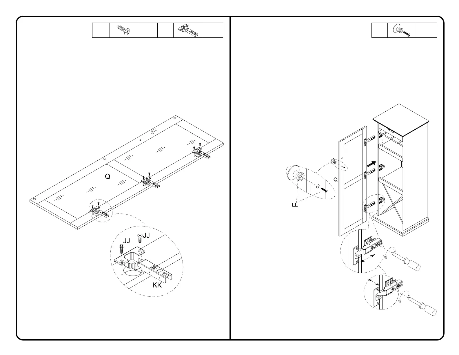 Attach door pull and screw (LL) to the front of door panel (Q)