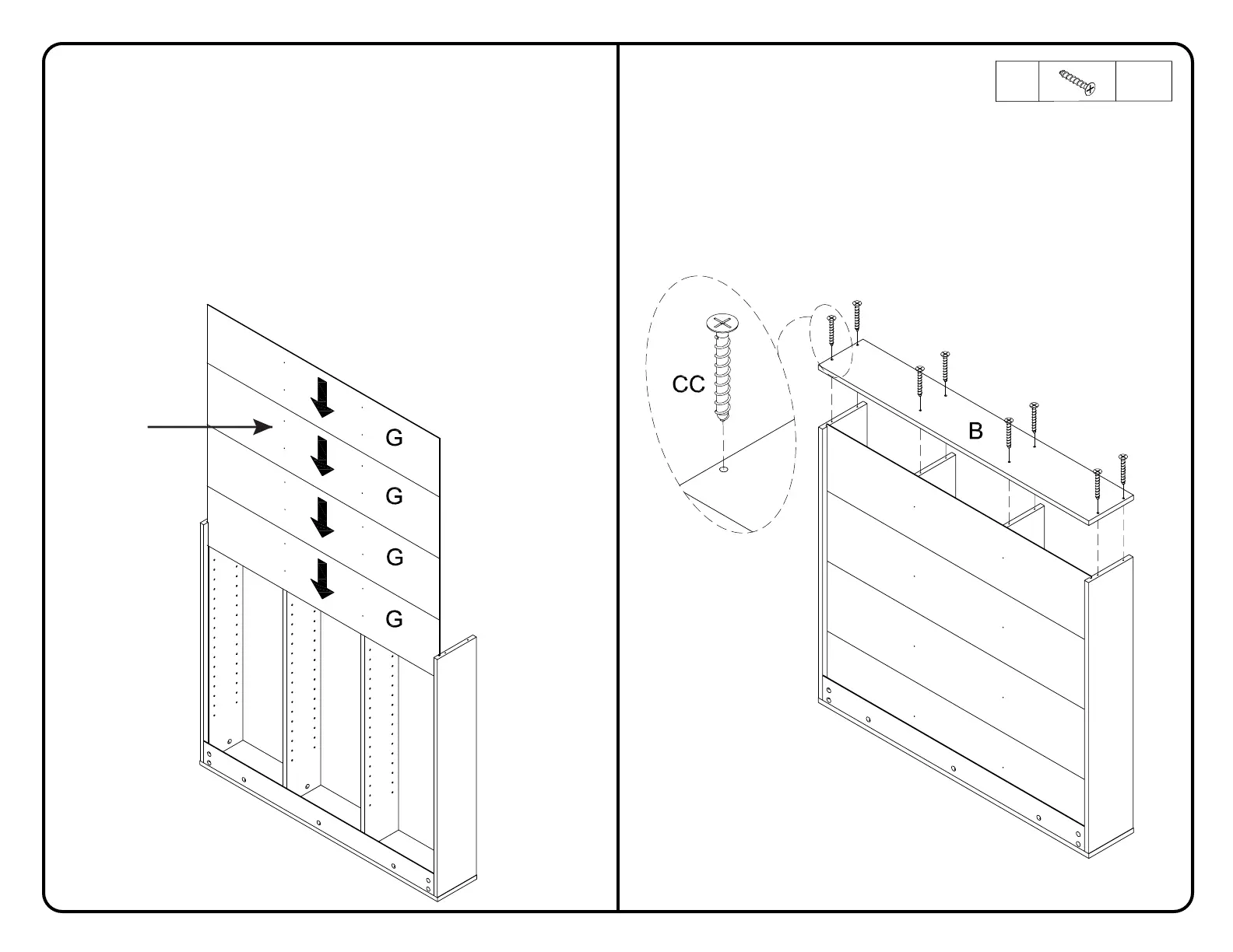Attach panel B with 8 screws (CC) using a Phillips screwdriver.