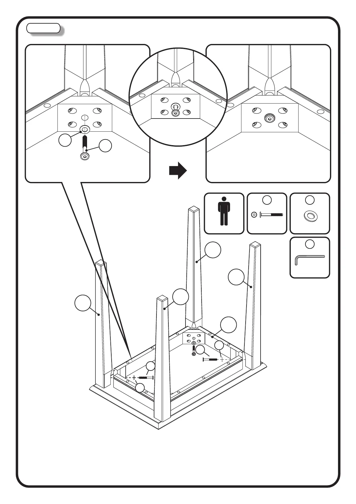 Attach the legs (02) to the top panel (01) as shown below using flat washers (B)