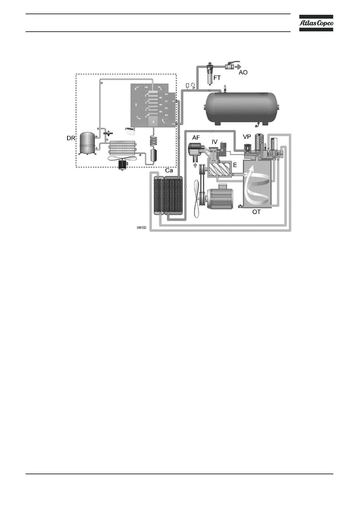 minimum pressure valve (Vp), air cooler (Ca) and air dryer (DR) towards the air outlet (AO).