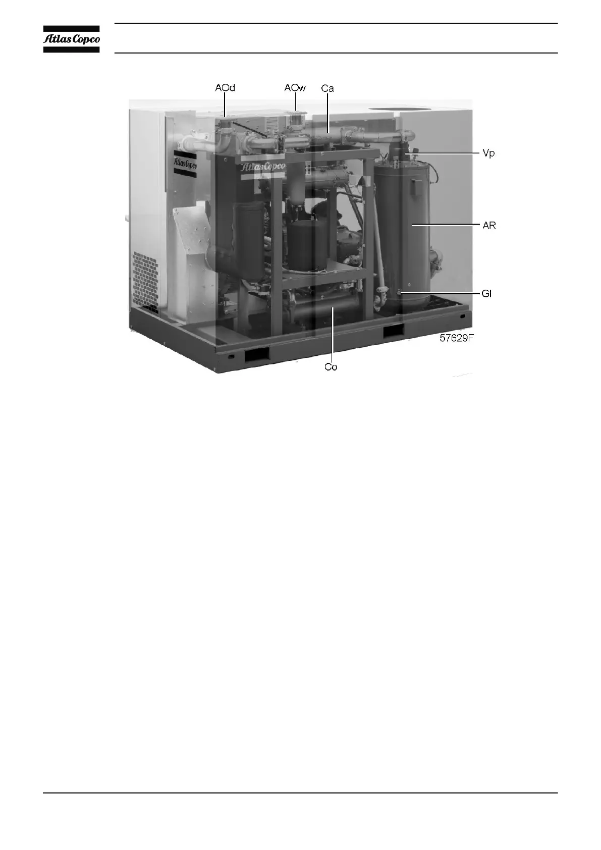 On GA Pack compressors, the cooled air is discharged through condensate trap (MTa) and outlet (AOw)