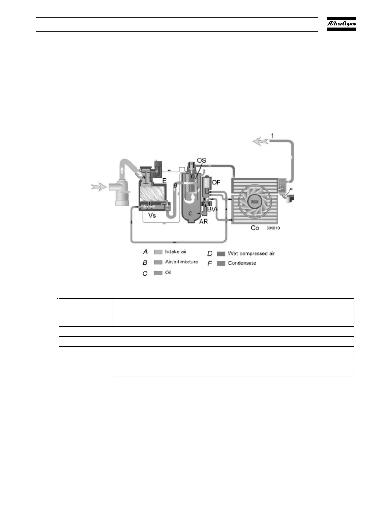 action.The rest is removed by oil separator (OS). The oil collects in the lower part of air receiver/oil
