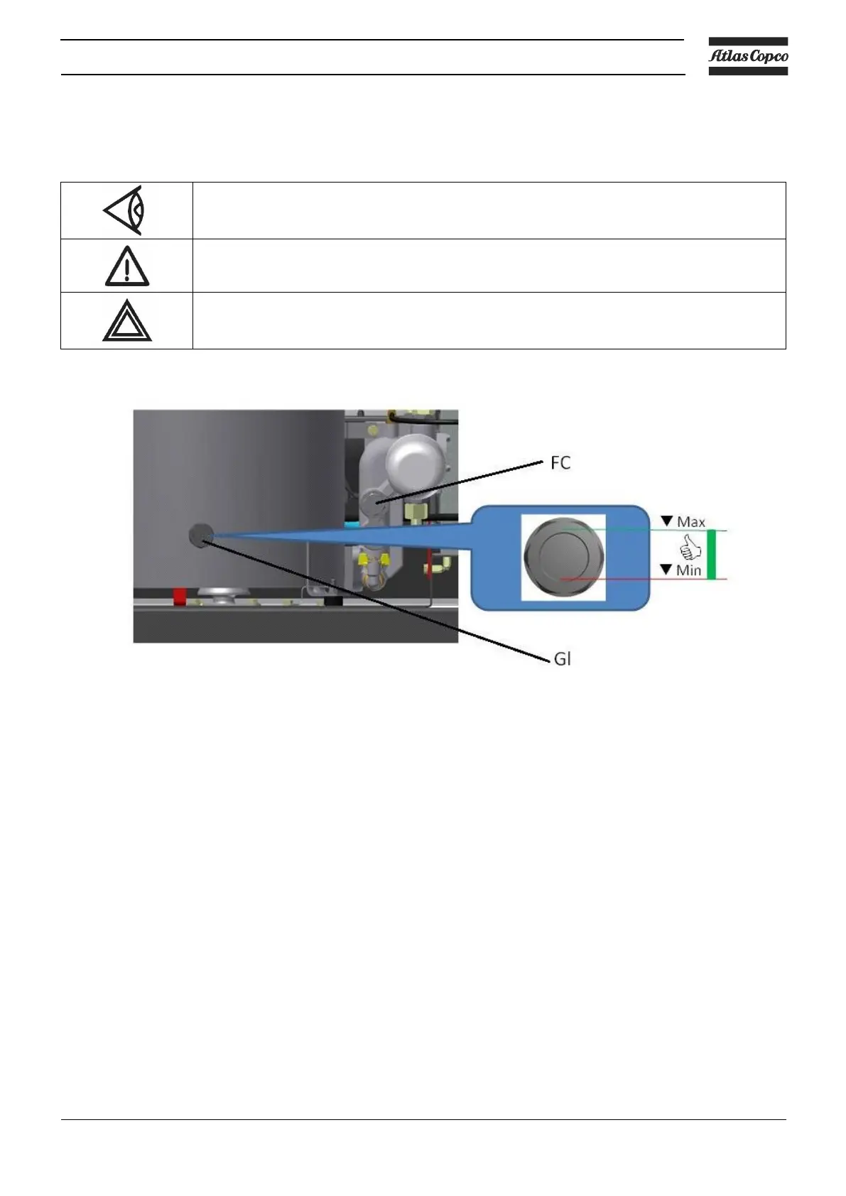 A few minutes after stopping, the oil level should reach the top of the oil sight glass (GI).