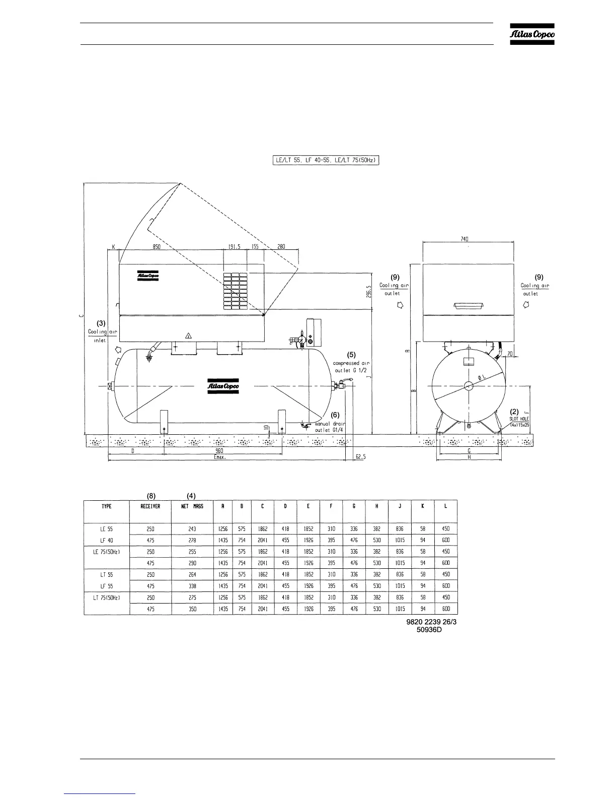 Fig. 2.8 Dimension drawing, LE/LT55/75 and LF40/55 Complete Unit with optional silencing hood
