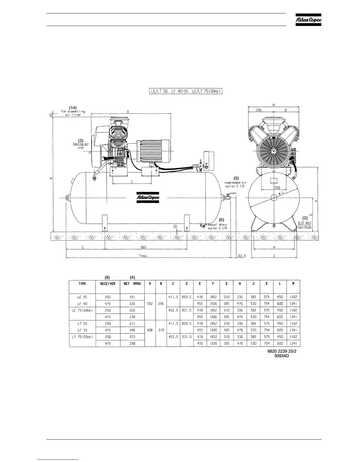 Fig. 2.6 Dimension drawing, LE/LT55/75 and LF40/55 Complete Unit (horizontal 250/475 l receiver)