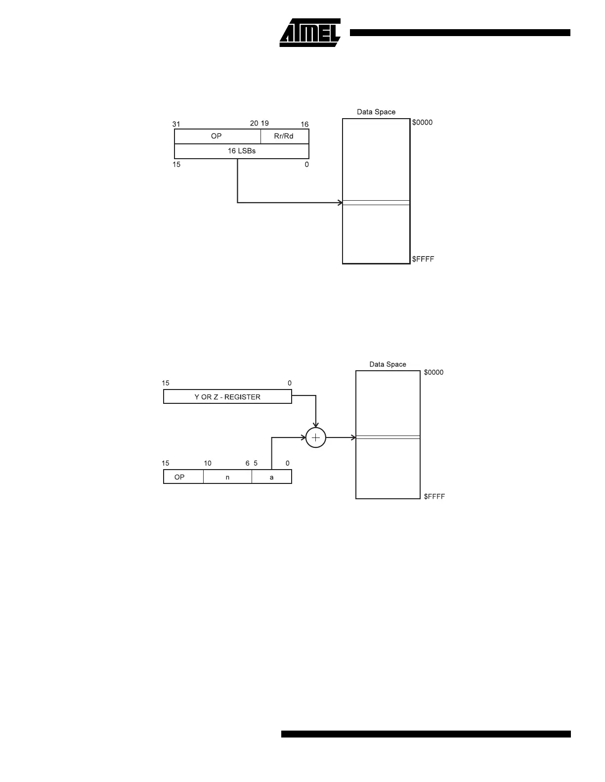 A 16-bit Data Address is contained in the 16 LSBs of a two-word instruction. Rd/Rr specify the destination or source