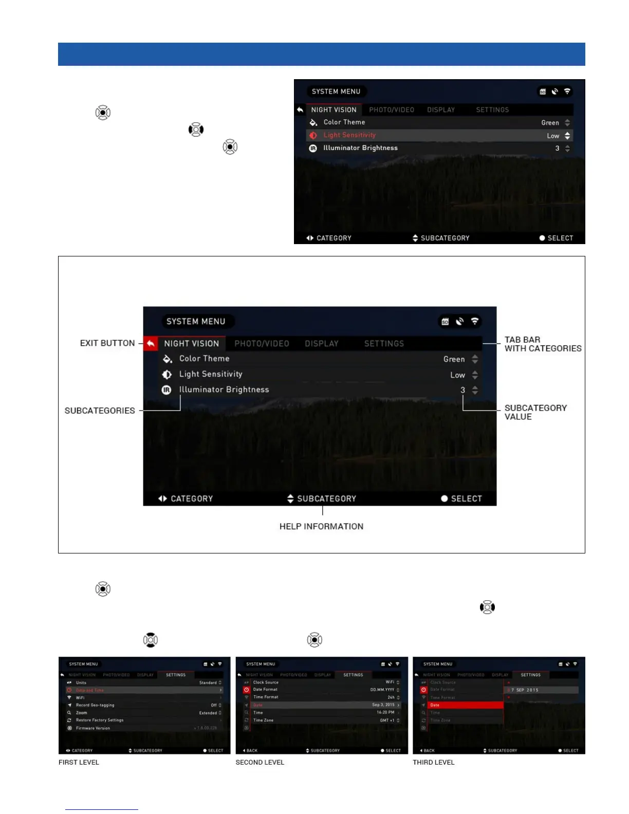Each tab includes subcategories. To select a particular subcategory you should use the UP and