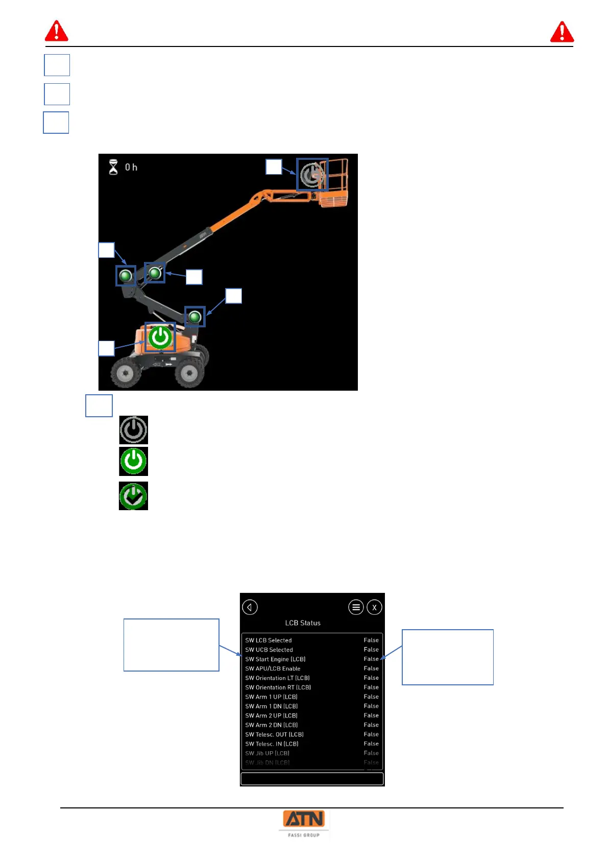 Condition of the machine fully lowered (green lights) and lower control station active.