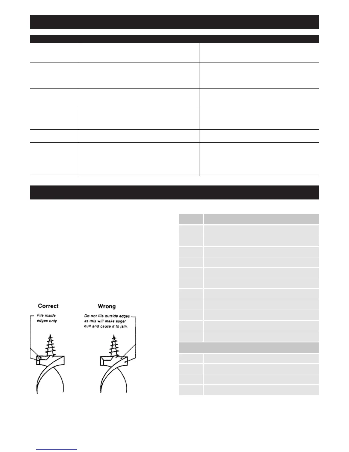 1. Auger will not turn Blunt auger, must be sharp especially for large holes over Sharpen – see instructions below.