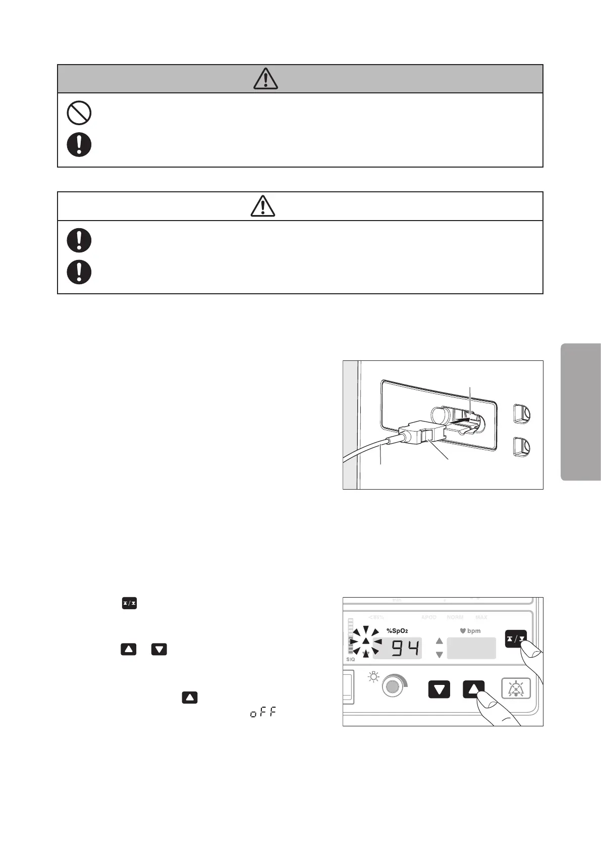 You can set upper/lower alarm limits respectively for SpO2 and the pulse rate monitored with the pulse oximeter.