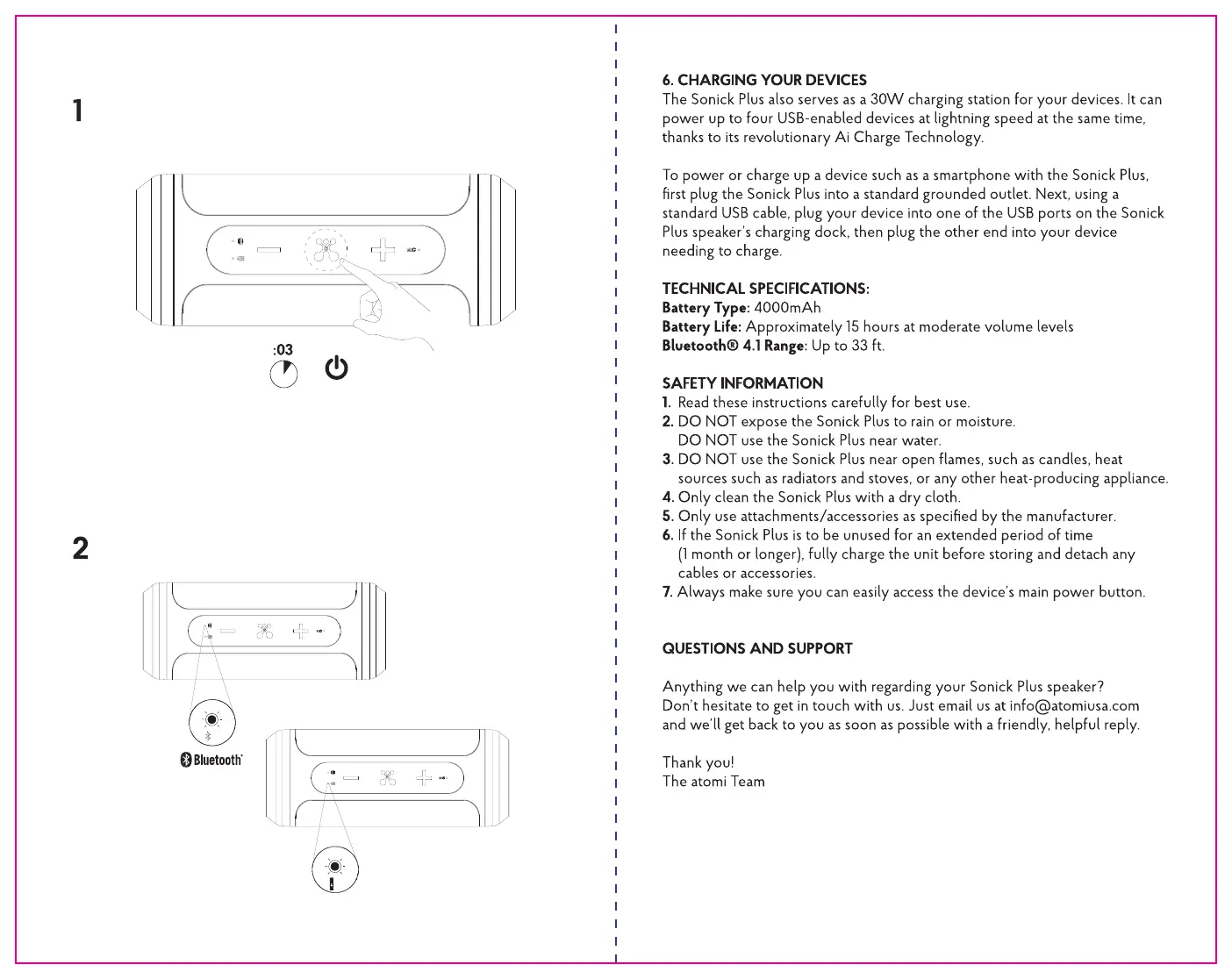 ATOMI Sonick Plus - Technical Specifications; Battery Type and Life; Bluetooth Range; Safety Information
