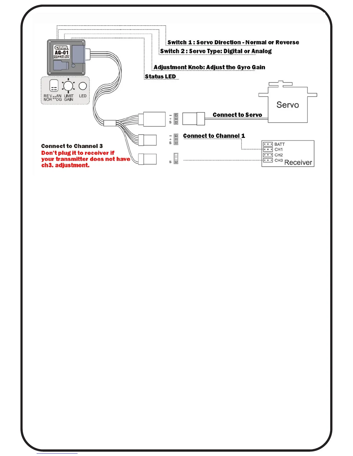 connect Ch.3 cable to receiver and adjust gyro gain value thru transmier.