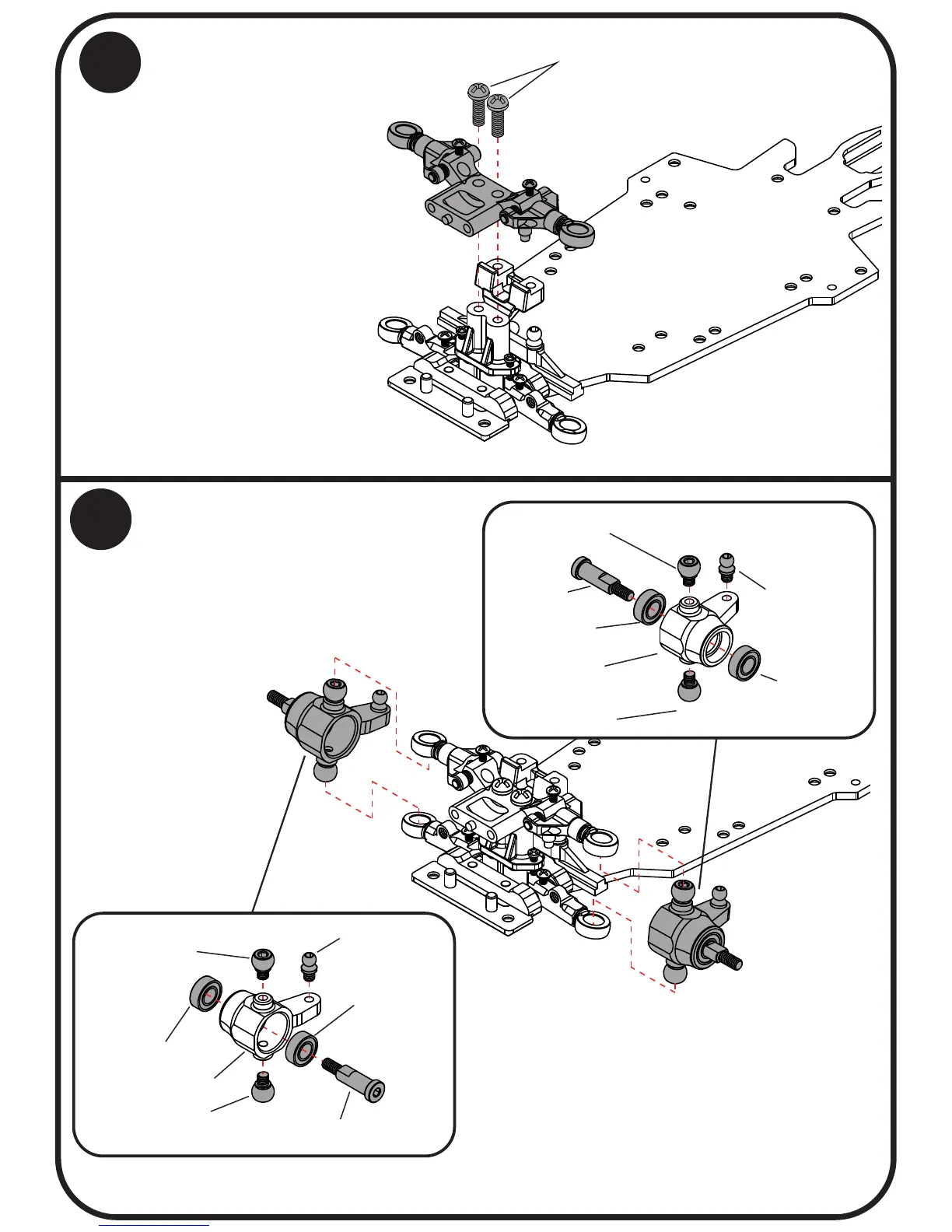 Atomic DRZ - Steering and Upper Mount Assembly; 6. Attaching Upper suspension mount; 7. Attaching Steering Assembly