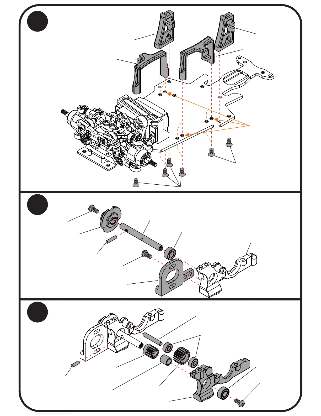Atomic DRZ - Battery Mount and Drivetrain Assembly; 13. Attaching Battery mount & body mount; 14. Motor mount & R gear box assembly; 15. Gear box assembly