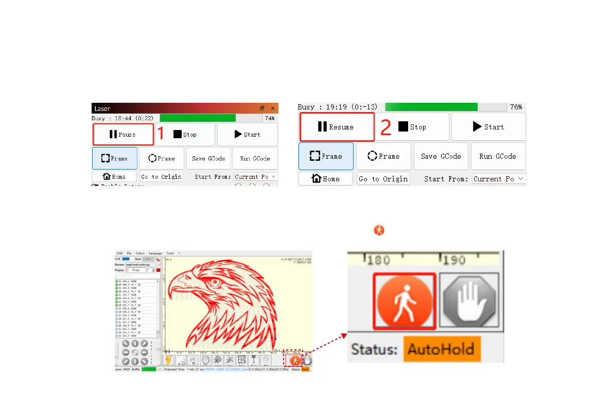 le couvercle de la boîte pour mettre la machine de gravure en pause, puis cliquer sur le " " dans le coin inférieur droit du logiciel. La machine