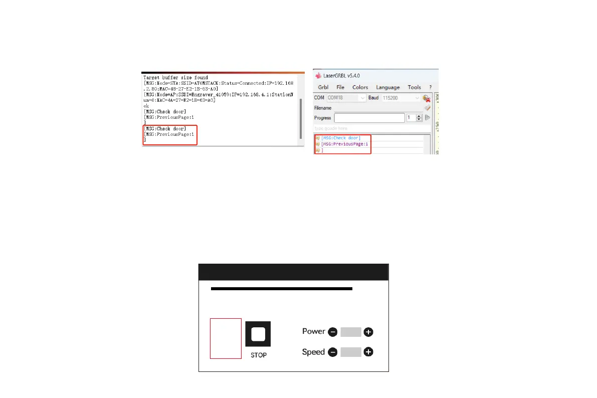 LightBurn e LaserGRBL visualizzeranno i seguenti prompt di codice: "[MSG:Check door][MSG:PreviousPage:1]";