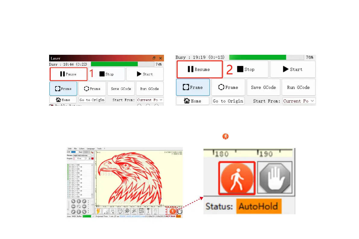 scatola per mettere in pausa la macchina per incidere, quindi fare clic su pausa in LightBurn e dopo 5 secondi, fare clic su Riprendi. La macchina