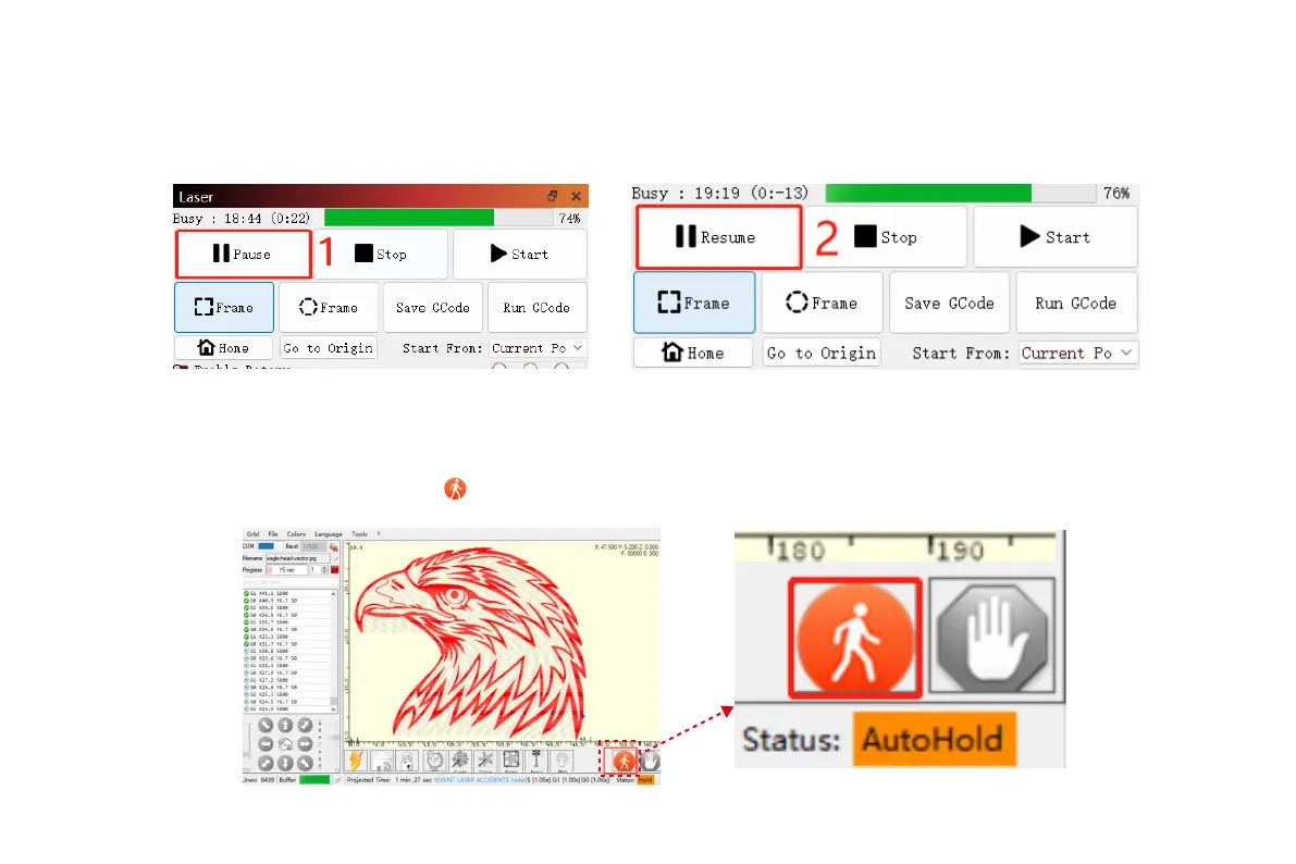 máquina de grabado, luego hacer clic en pausar en LightBurn y después de 5 segundos, hacer clic en reanudar. La máquina continuará