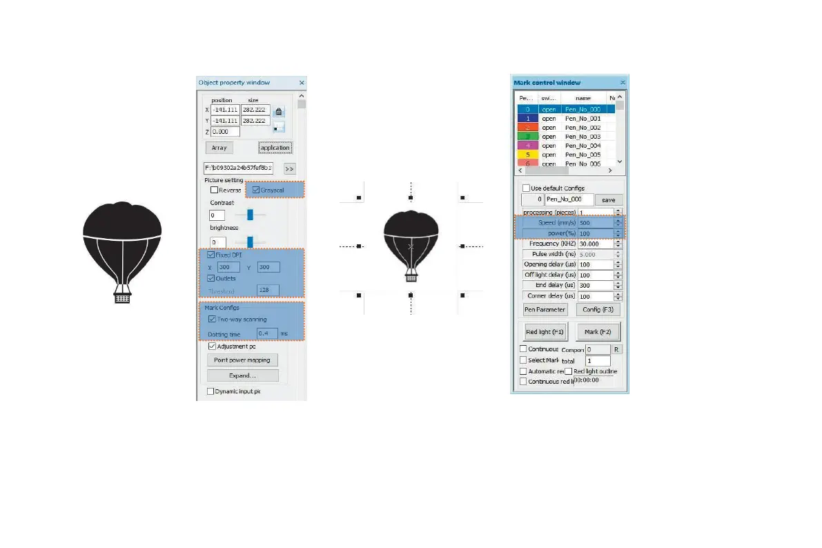 Paramètres de gravure. Réglez "Vitesse (mm/s)" à 500 et "Puissance (%)" à 100.