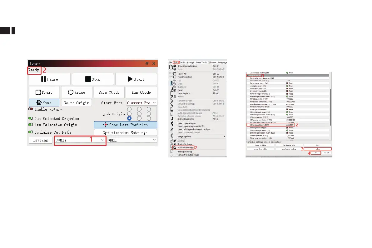1.Run LightBurn, connect to engraver, “Ready”displayed at