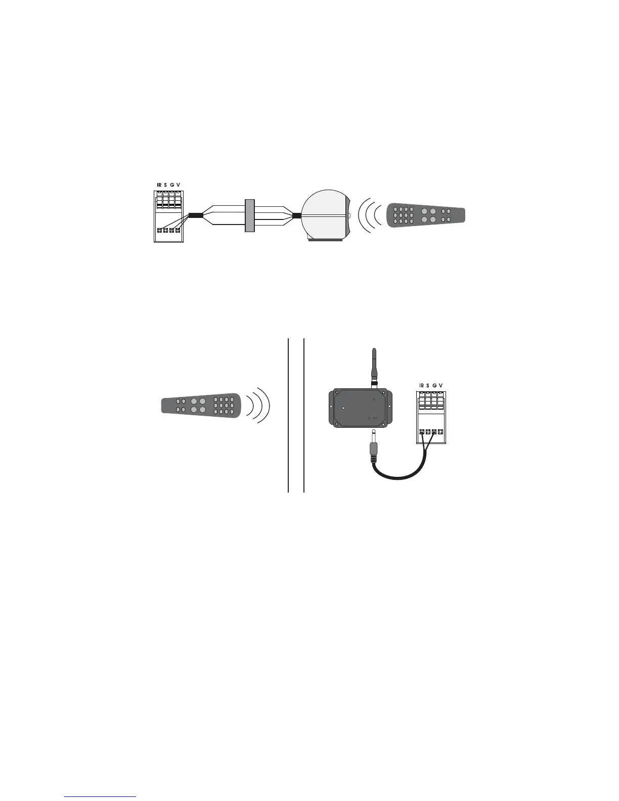 Connect a third party RF-to-IR base station to any one Room IR Input to control any or all rooms