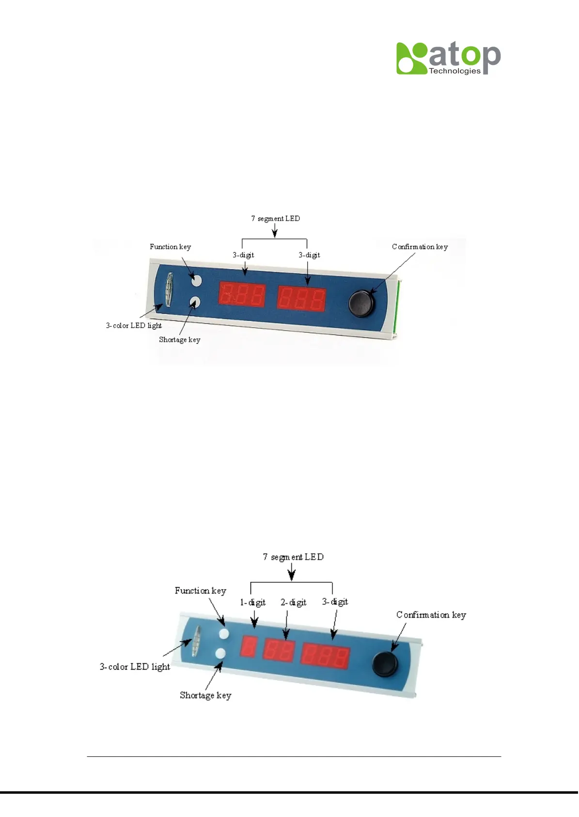 7-segment LED display, 3 buttons and 3-color LED lights, AT502V also has two arrows.