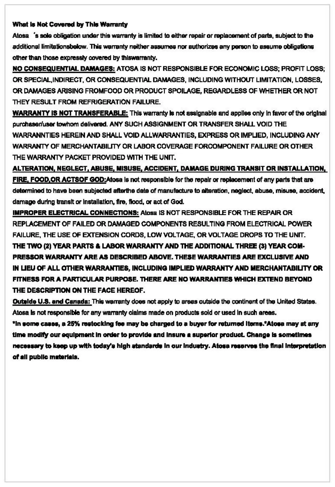 Atosa MBF8003 - What Is Not Covered by This Warranty