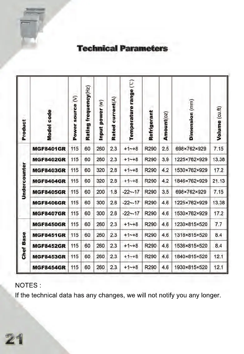 Atosa MSF8304GR - T E C H N I C a L P a R a Me T E R