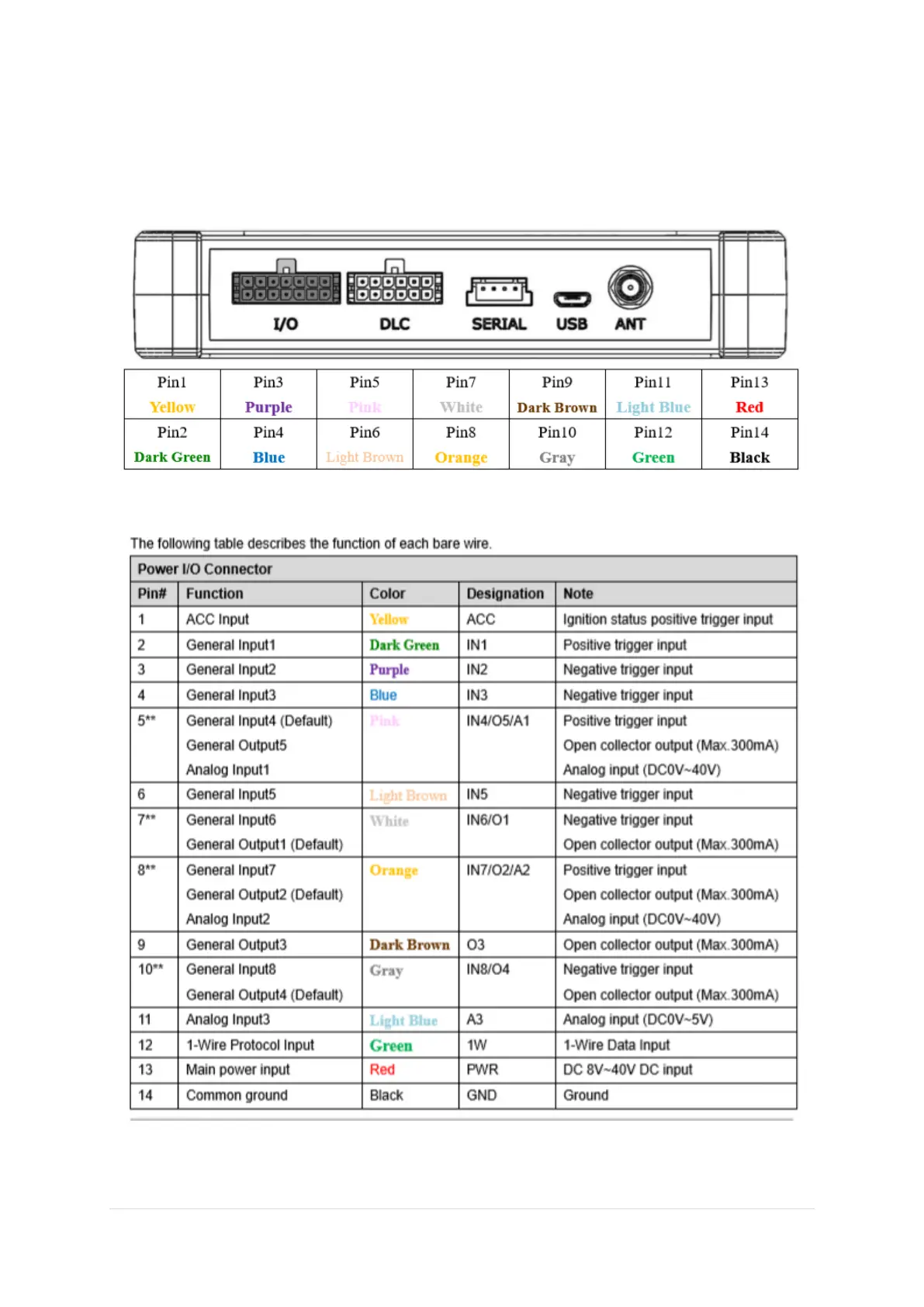 ATrack AK11 - Power I;O Pin Assignment; I;O Connector Pinout and Functions