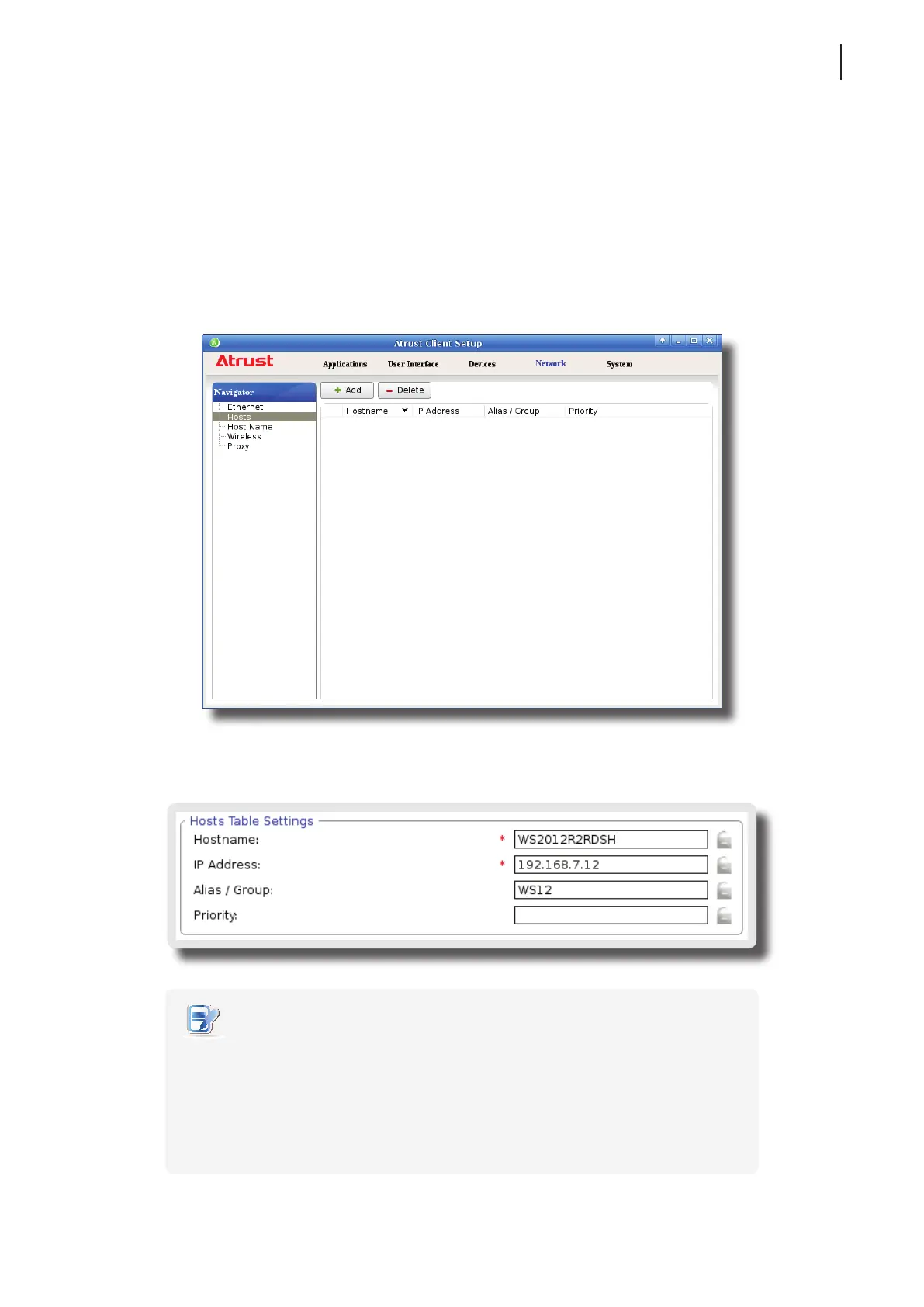1. On Atrust Client Setup, click Network > Hosts to open the Host list.