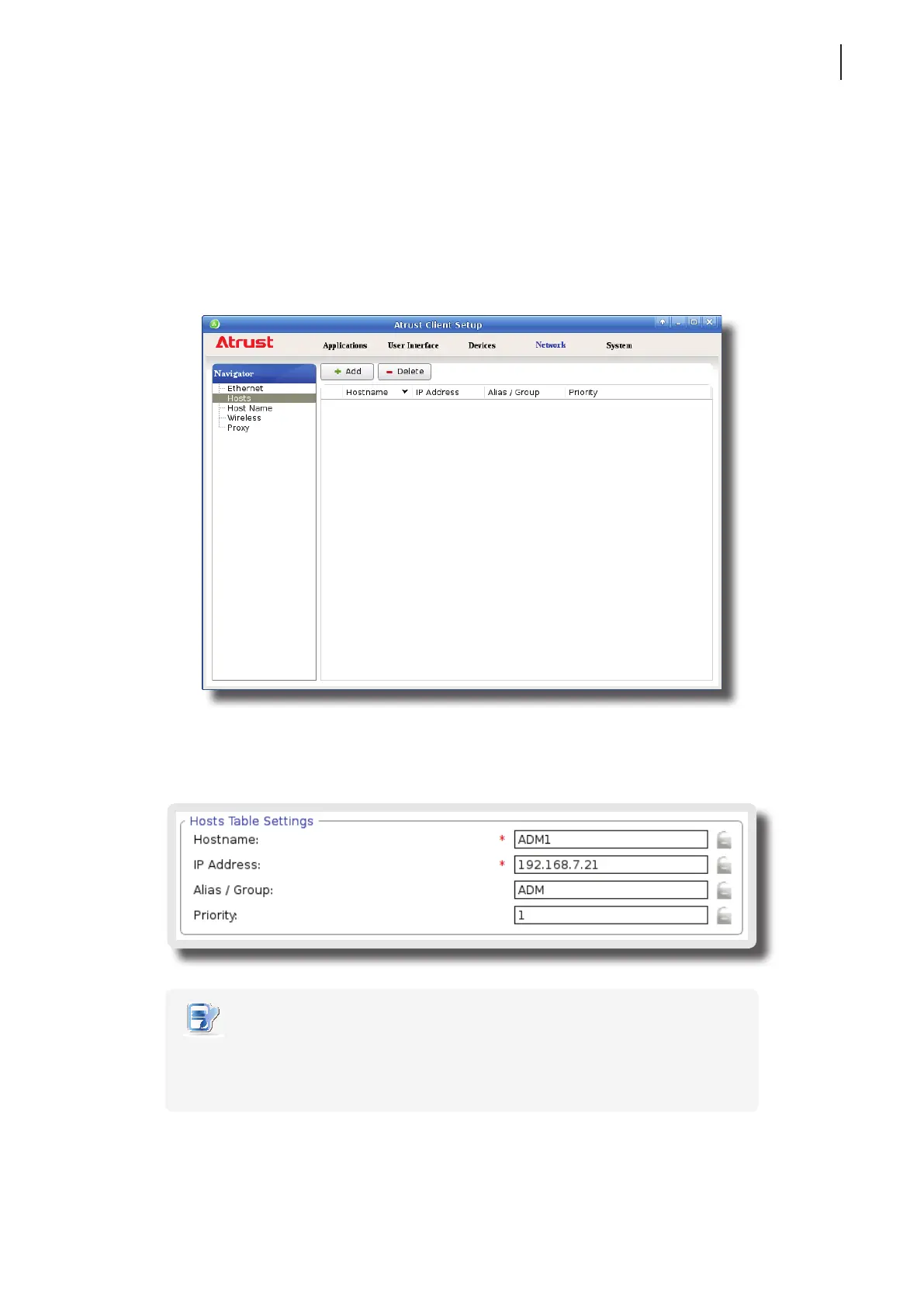 1. On Atrust Client Setup, click Network > Hosts to open the Host list.