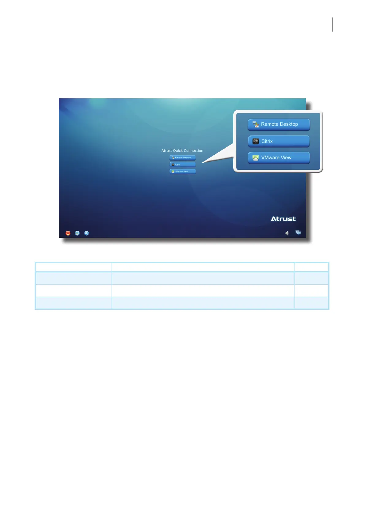 Through Atrust Quick Connection screen, you can access three types of desktop virtualization services: